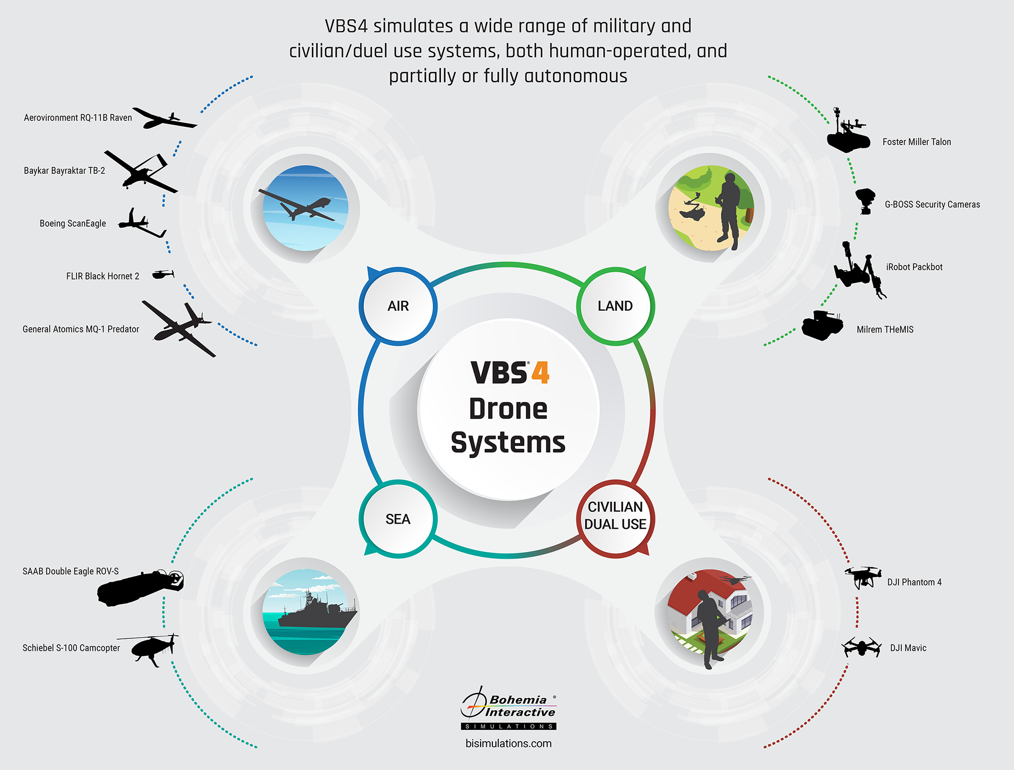 VBS4 includes over 50 drone models to provide numerous opportunities for more realistic and complex training. The below infographic shows some of the VBS4 drone systems for sea, air, land, and civilian dual use for you to use immediately.